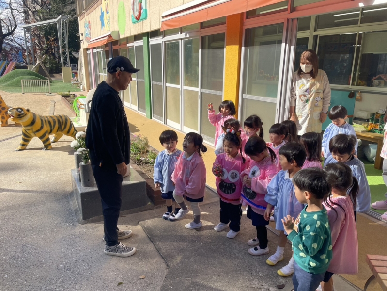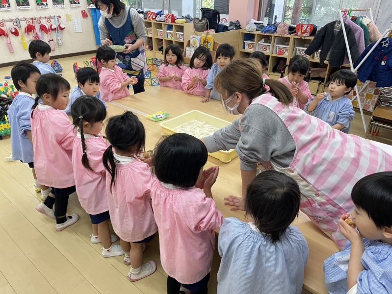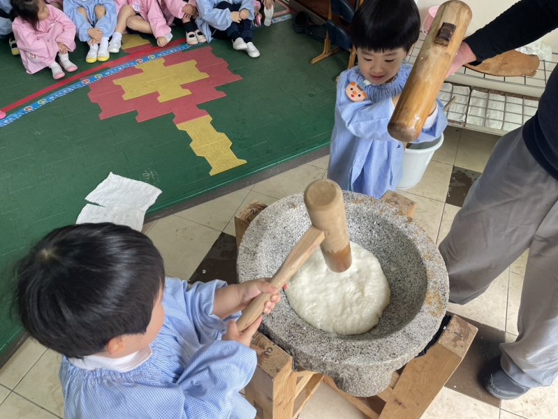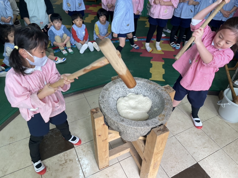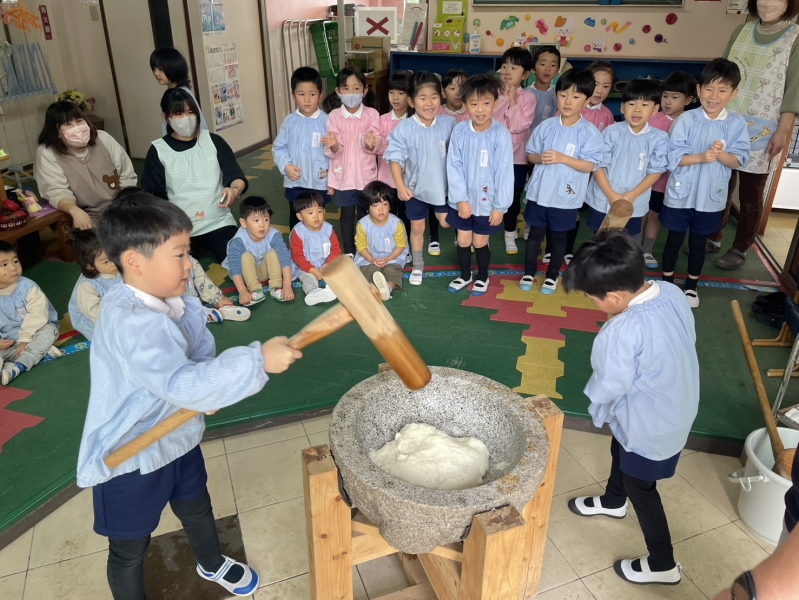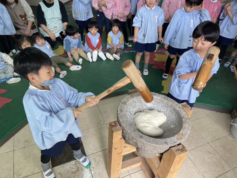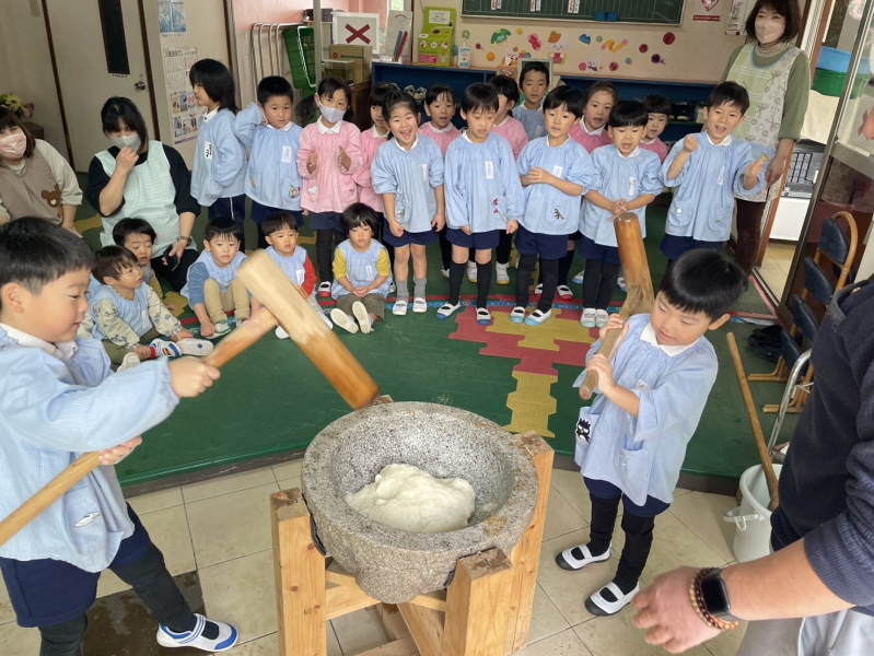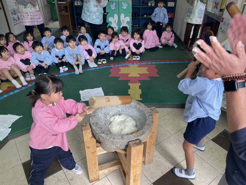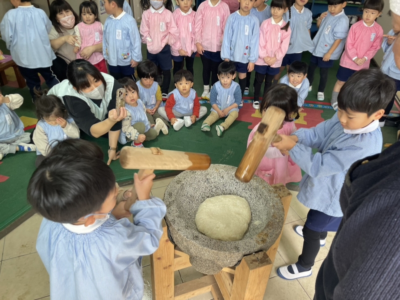 先日の11日、全員参加とはいきませんでしたが、お餅つきを経験しました。お米から餅に変化していく姿に園児たちは興味津々。みんな目を輝かせていました。餅つきを実際に経験していく中に、一人一人の声も弾んでいました。